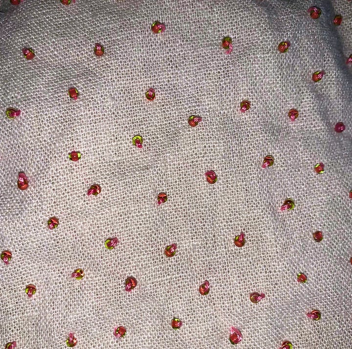 A little cap I’m sewing beads onto! It’s too hard to capture on photo, but they form a subtle gradient of color from left to right. What kind of cap is this? I don’t know. Will I wear this when I get groceries? Yes.
